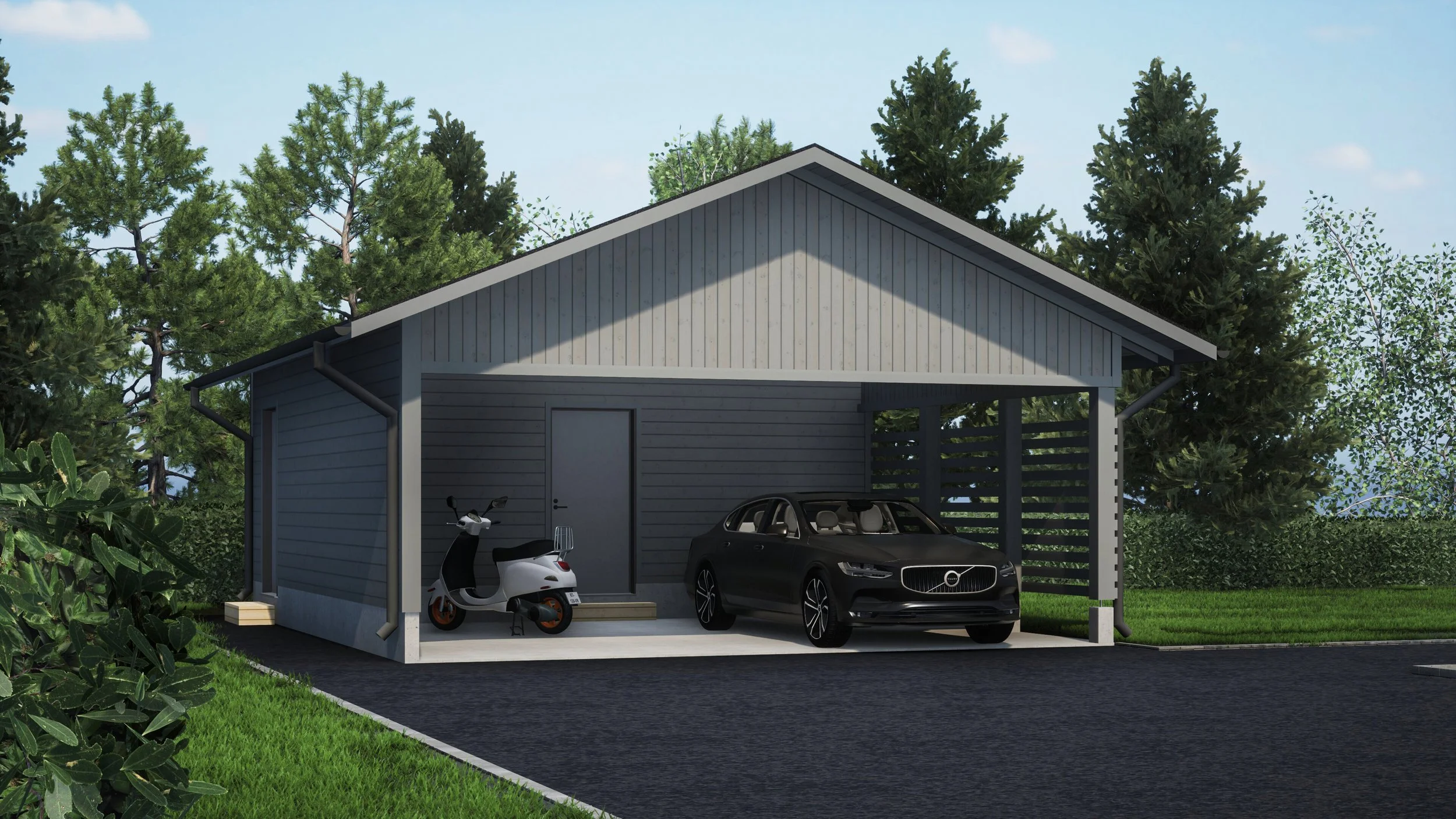 Tämä moderni autotalli kahdella avopaikalla ja säilytystilalla on täydellinen ratkaisu, jos tarvitset tilaa useammalle autolle ja runsaasti säilytystilaa.